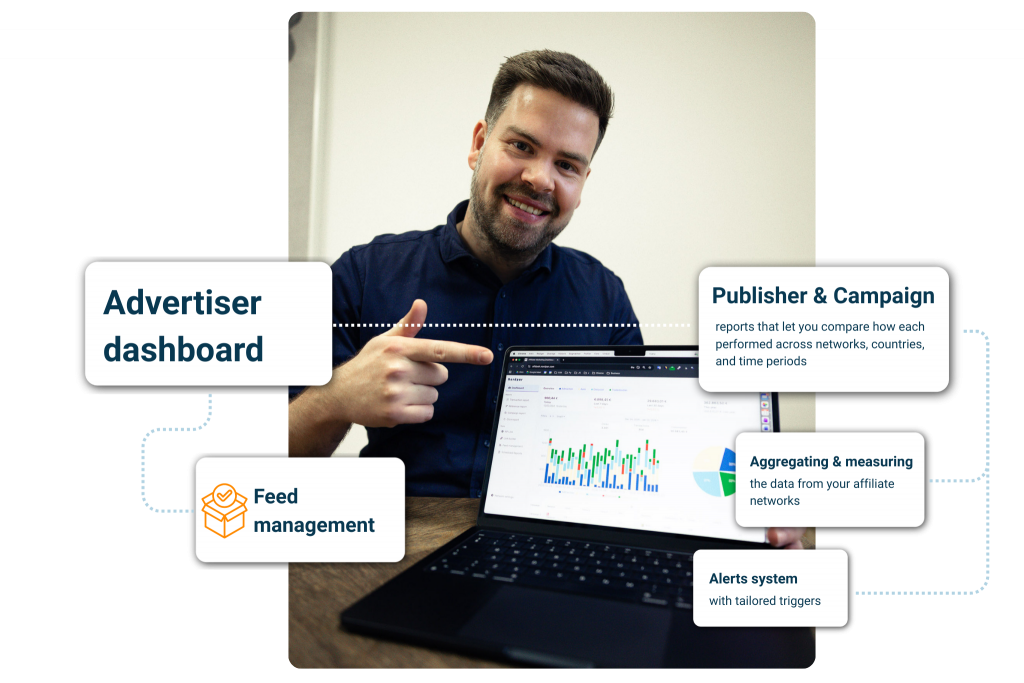 Advertiser dashboard for affiliate data, feeds, and monitoring