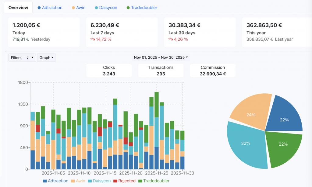 Connect all your affiliate networks in one dashboard and analyze performance by network and campaign. Track trends with year-over-year comparisons and stay in full control of how your affiliate business is developing.
